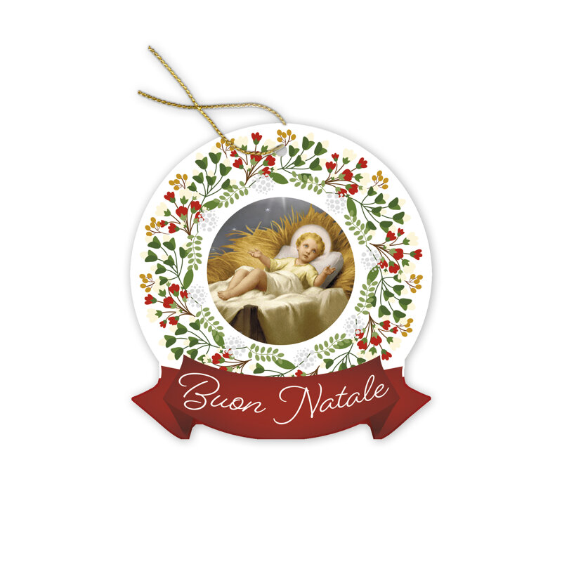 Fresca ed elegante decorazione natalizia raffigurante Gesù Bambino adagiato nella sua culla. Adatta a dare un tocco natalizio elegante e contemporaneo a qualsiasi spazio della casa.
