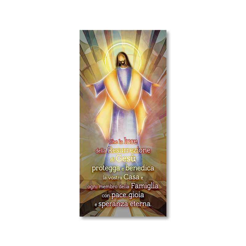 Tavola di Benedizione stampata su carta ad effetto perlato raffigurante la Resurrezione di Gesù in stile contemporaneo. A retro è stampata la personalizzazione richiesta.