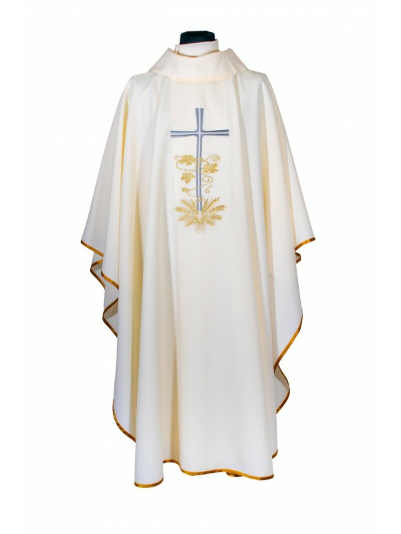 Casula in poliestere colore avorio con decoro Croce Foglie Spighe ricamato ambo i lati. La casula è ben rifinita con sbieco dorato. Ottimo bilanciamento tra qualità, durabilità e soprattutto prezzo.