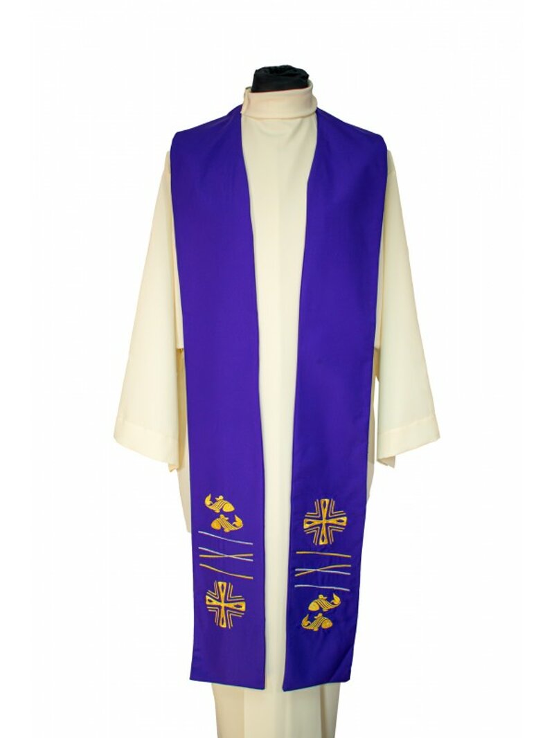 Stola colore viola in poliestere con ricamo dorato di Croce e pesci. Ottimo bilanciamento tra qualità, durabilità e soprattutto prezzo.