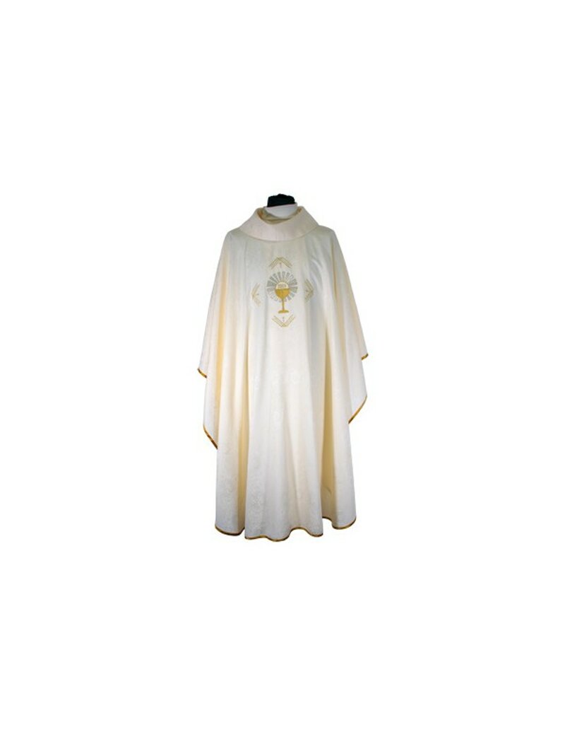 Casula in poliestere disegno damascato colore avorio con ricamo JHS oro e Calice. La casula è ben rifinita con sbieco dorato. Ottimo bilanciamento tra qualità, durabilità e soprattutto prezzo.