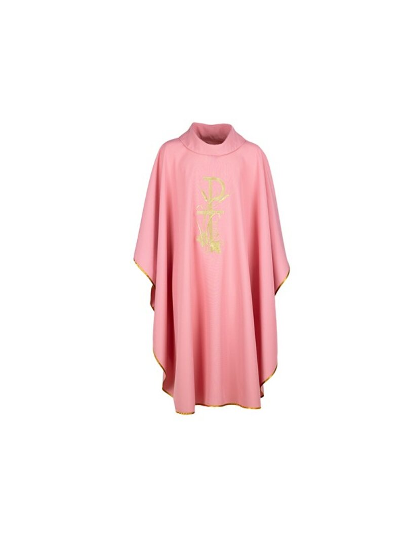 Casula in poliestere colore rosa ricamata con P, Croce, Spighe, Uva ambo i lati e rifinita con sbieco dorato. Ottimo bilanciamento tra qualità, durabilità e soprattutto prezzo.