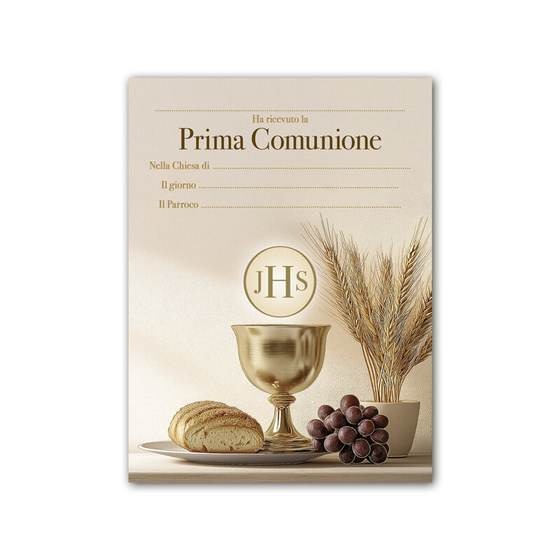 Diploma ricordo della Prima Comunione. Stampato in carta pergamena e rifinito con dettagli in oro a caldo, è un bellissimo riconoscimento che attesta la ricezione del Sacramento.