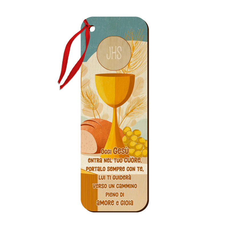Simpatico ed allo stesso tempo elegante, questo segnalibro con simboli eucaristici e frase stampata direttamente su legno, può essere utilizzato anche come chiudipacco grazie al cordino in raso rosso.