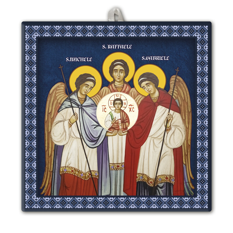 Piastrella Tre Arcangeli con Gesù Fanciullo 20x20 cm in scatola regalo.