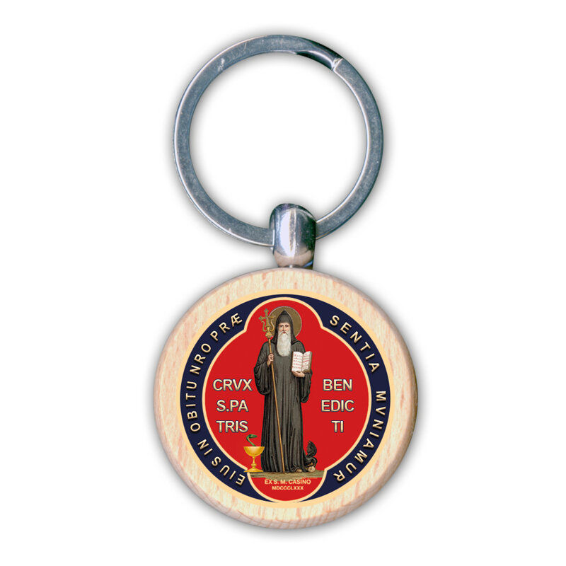 Utile portachiavi dall'accattivante sagoma rotonda con l'immagine di San Benedetto e croce a retro. La leggerezza e le piccole dimensioni lo rendono perfetto per essere riposto in tasche e borsette.